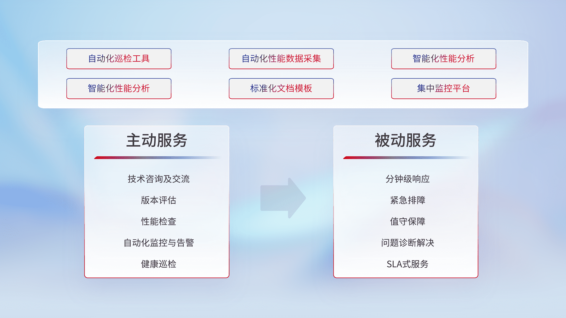 智能化工具和标准化文档,,,,保障服务质量,,,提供主动服务(包含技术咨询、、版本评估、、、性能检查、、、自动化监控与告警、、、健康巡检)和被动服务包含(分钟级响应、、、紧急排障、、值守保障、、、问题诊断解决、、SLA服务)。。。。
